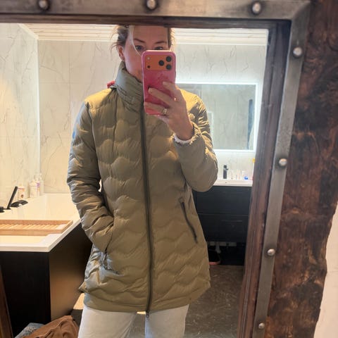 Oliven grønn lekker formsydd kåpe. Den er lett, varm og tidløs. Str L