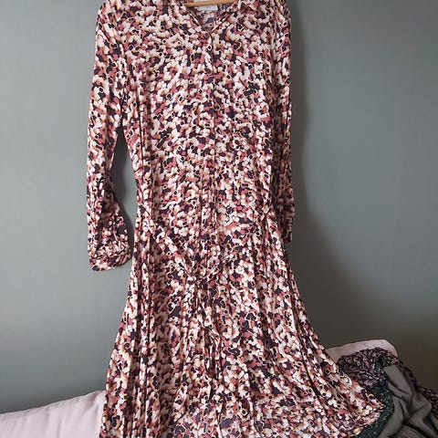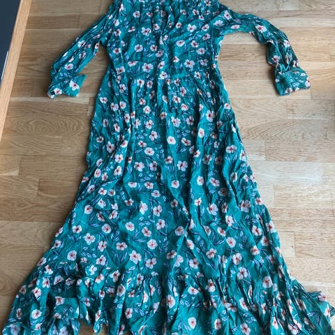 H&M sommerkjole for dame i størrelse XS. Kjolen er flerfarget med blomstrete mønster og er laget i polyester. Modellen har lange ermer og ankellang lengde, egnet til bruk i hverdagen eller til enkle sommeranledninger. Materialet er lett og tynt, og kjolen kan brukes alene eller med strømpebukse eller leggings etter behov.