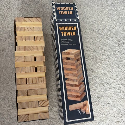 Tower Wooden Classic tårnspill med treklosser. Spillet består av rektangulære treklosser som stables til et tårn, hvor spillerne etter tur fjerner og flytter klosser uten at tårnet faller. Egnet som familiespill og selskapslek for flere spillere. Passer for barn og voksne innenfor aldersanbefalingen angitt på esken.