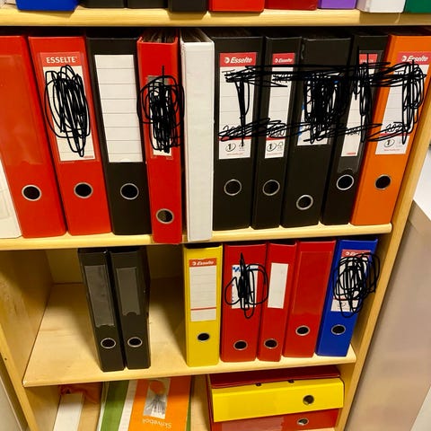 Skrivebord i tre med overhylle, uttrekkshylle og skap med dør. Bordet har plass til skjerm, tastatur og annet kontorutstyr. Medfølgende kontorstol har polstret sete og rygg med flerfarget mønster og hvitt understell med hjul. Egnet som arbeidsplass eller leksepult på kontor, stue eller barnerom.