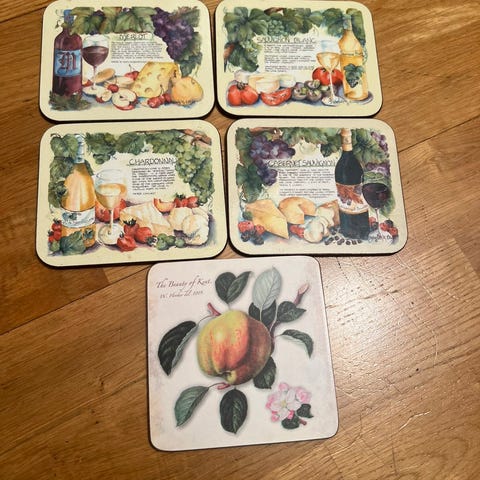 Flott eldre stativ/bokhylle,med dekkebrikker.Tre og kork.Fin eldre stilling stand,men noen merker.bud.8 brikker.