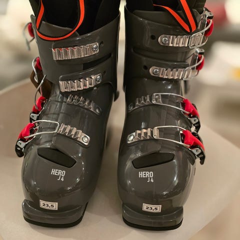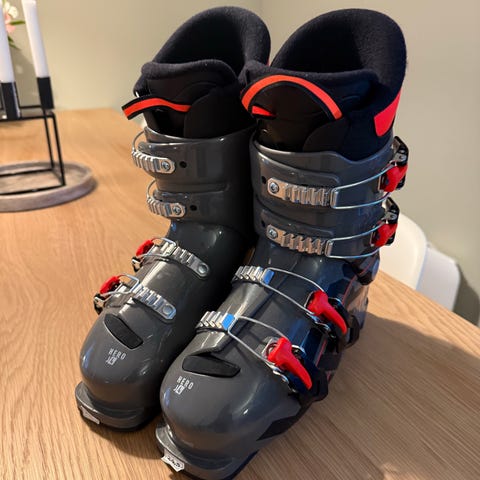 Rossignol Hero J3 alpinstøvler for barn. Skostørrelse er merket 205 (245 mm). Passet mitt barn da hun var 7 år, tilsvarer skostørrelse 32
