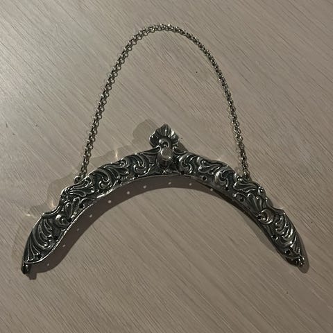Nordaker Bunader Panorama veskelås i sølvplett. Oksidert. Tradisjonelt utformet veskelås med buet fasong og gravert dekor. Modellen er beregnet for bunadsveske og festes øverst med klips.