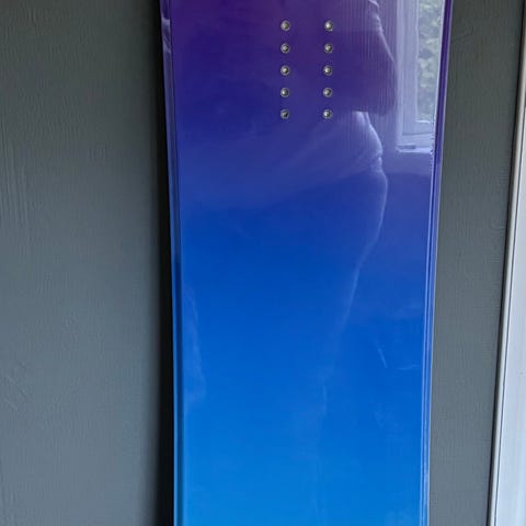 Blackhole snowboard med bindinger i svart farge. En binding på høyre mangler en del. Se bilde.