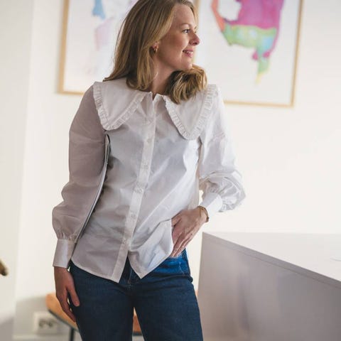 Klassisk hvit skjorte med vakre og eksklusive detaljer. Skjorten har en søt krage med håndsydd strass, puff over skuldrene og lange ermer. Den lukkes med skjult knappelukking i front og har en rett og avslappet passform.