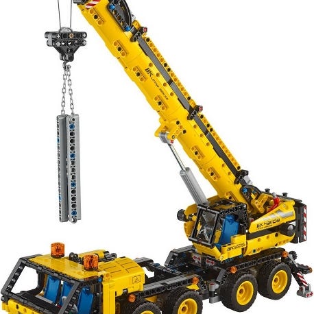LEGO Technic byggesett med lastebil, tilhenger og beltegraver. Settet består av en lastebil med flere bevegelige deler, blant annet førerhus og tilhenger med rampe for lasting og lossing. Beltegraveren har belter, bevegelig arm og skuffe. Fargene er hovedsakelig gul, svart og hvit med tekniske detaljer typisk for Technic-serien. Egnet for bygging, lek og som utstillingsmodell for LEGO Technic-interesserte.
