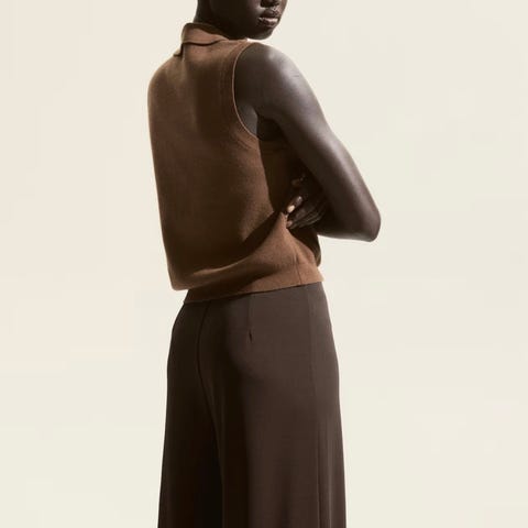 H&M bukse for dame i brun farge, størrelse M. Buksen har rett, vid passform med legg foran og skrålommer i sidene. Egnet til både hverdags- og kontorbruk, og kan kombineres med ulike topper og skjorter for et klassisk uttrykk.