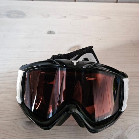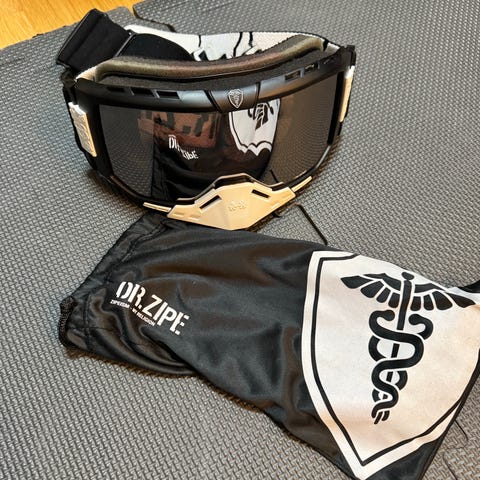Selger et par Dr. Zipe skibriller med hvit elastisk stropp med logo og oransje linse. Rammen er svart, og brillene leveres med oppbevaringspose. Egnet til bruk i skibakken og annen vintersport der det er behov for øyebeskyttelse mot vind og snø.