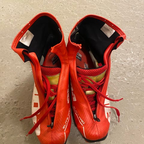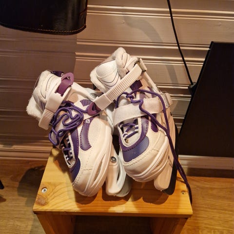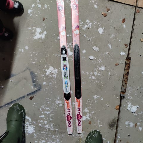 Barneski i ukjent merke i rosa farge med motiv og enkle reimer/bindinger som festes på vanlige sko. Skiene leveres sammen med tilhørende staver med røde håndtak. Egnet for små barn som skal prøve ski for første gang eller til lek på snø.