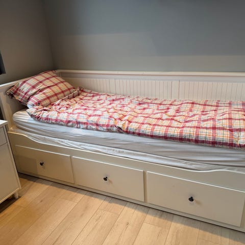 IKEA Hemnes dagseng med skuffer i hvit utførelse. Dagsengen kan brukes som sofa på dagtid og som enkel- eller dobbeltseng ved å trekke ut underdelen. Modellen har tre romslige skuffer under for oppbevaring av sengetøy eller annet. Klassisk design med sprosset rygg og sidepaneler. Egner seg til soverom, gjesterom eller stue der det er behov for både sitte- og soveplass.
