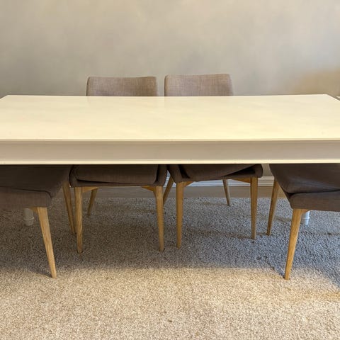 Kraftig/massivt langbord i tre. Understell malt i bonderød. Godt håndtverk og gode materialer. Noen lysere flekker i treplaten, ellers i god stand. Hentes på Frogner/Oslo.
