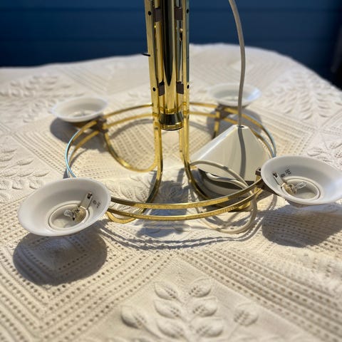 Lampen er pent brukt, dimbar, 4x20W lyspærer og en lampe i midten som lyser ned og har en egen bryter.