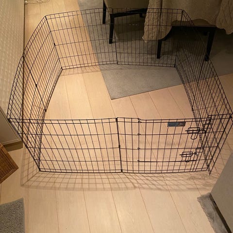 Lag et trygt sted som hunden din kan ha som sitt eget! Hundegård i metall med gittervegger og dør med lås. God plass til en seng/kurv, pledd og andre ting som skaper trygghet hos hunden. Leveres med tilpasset bunnbrett i plast som samler opp søl og gjør rengjøring enklere. Egnet som innhegning for små og mellomstore hunder, både innendørs og i hage eller gårdsplass. Fargen er svart.