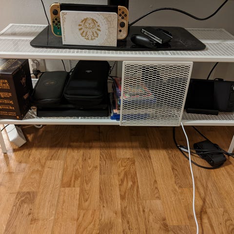 Selger en pent brukt IKEA BAGGEBO TV-benk i hvit metall. Benken har et minimalistisk og moderne design med nettinghyller som gir et lett og luftig uttrykk i rommet.