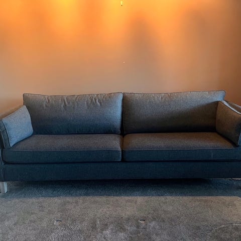Sofaen har rette linjer med rygg og sete delt i to puter. Armlenene er rette og polstrede. Grå spekket stoff. Sofa har stått ved vindu og er noe solbleket på rygg og putekanter, ellers pent brukt og i god stand, Hentes på Frogner/Oslo.