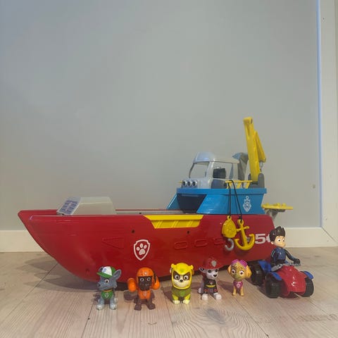 Paw Patrol Zuma lekebåt i plast. Figuren Zuma kan settes fast i båten. Lekebåten er i fargene oransje, blå, grå og hvit, og er utformet som et kjøretøy fra Paw Patrol-serien. Egnet som rollelek-leke for barn som liker Paw Patrol og kjøretøy. Passer til innendørs lek på gulv eller bord. Størrelse er tilpasset barnehender og kan kombineres med andre Paw Patrol-leker i samme skala.