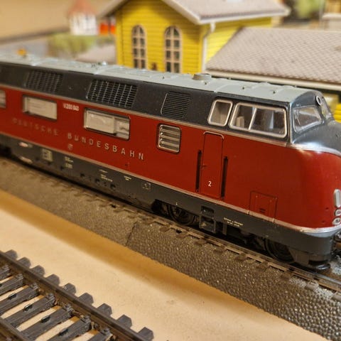 Modelltog lokomotiv i rød farge. Testet OK. Lokomotivet har koblinger i begge ender og detaljerte sider. nr5