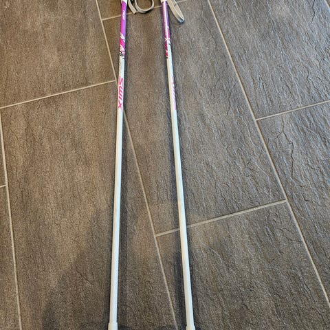 Stavene er grå med hvite trinser og hvite håndtak med håndremmer. Egner seg til bruk sammen med langrennsski for barn i aktuell høyde.