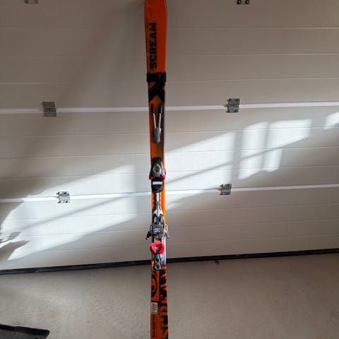 Atomic Race 9.16 alpinski i rød og hvit farge. Skiene har integrerte bindinger og er konstruert som carvingski for preparerte bakker. Modellen er en racerinspirert alpinski som egner seg for kjøring i alpinanlegg.
