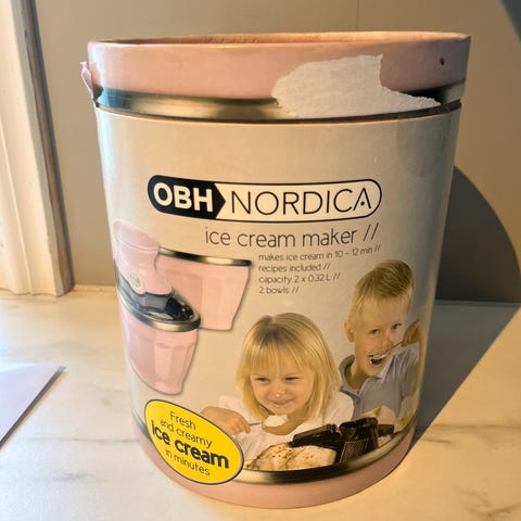Krups iskremmaskin av plast og metall. Pakken inneholder blant annet frysebolle, lokk i gjennomsiktig plast, rører og plastkranser/rammer. Krups iskremmaskin brukes til tilberedning og innfrysing av iskremblandinger hjemme.