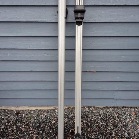 Takstativ universal i metall med sølvfargede bæreprofiler og svarte plastføtter. Består av to tverrstenger som festes på bilens takrails eller festepunkter, avhengig av biltype og kompatibilitet. Egnet til montering av takboks, sykkelstativ eller annet taklastutstyr innenfor godkjent vektgrense for bilen og stativet. Passform og maksimalt taklast bør kontrolleres mot aktuell bilmodell før bruk.