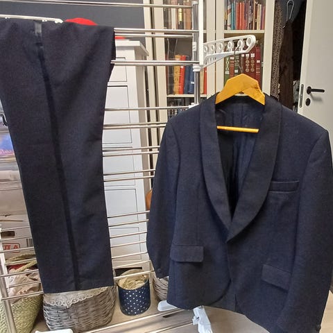 Smokingen er av merke Frislid. Størrelse C100. Nåværende eier er 170 cm høy og har middels kroppsbygning. Den er brukt max et par ganger. Kjøpt i 1993. Ingen slitasjetegn.