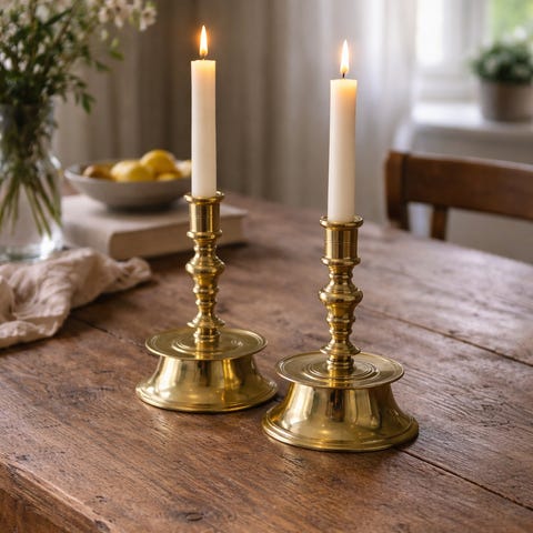 Lysestake, vintage, messing, gull farget, cottegecore, grandmacore, stearinlys.
