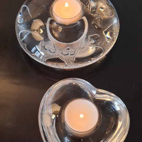 Orrefors telysholdere i glass. Runde lysestaker "Puck" serien for telys, laget i klart glass. Trekanten fra serien " Triangel". Passer som borddekorasjon eller stemningslys i ulike rom.