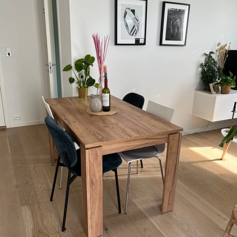 Haster på grunn av flytting, spisebord i mangotre, metall