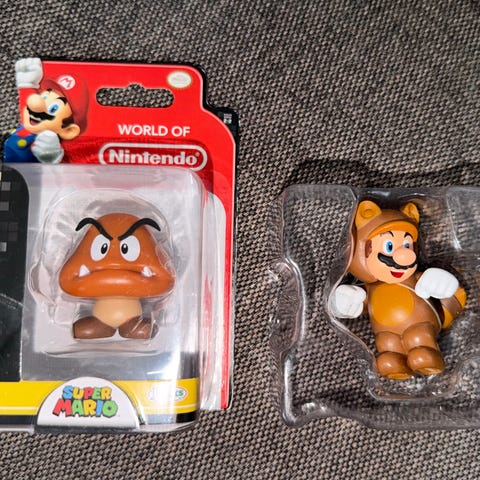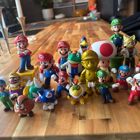 Selger unna en samling av figurer fra Super Mario universet. Mange står med 2007 og 2009 årstall på seg. Luigi, Yoshi, Donkey Kong med flere. Inneholder også to låser og tre nøkkelringer. Tre av figurene skal ha fjærer under seg men de har løsnet. Dobbelt av flere av figurene. Gi bud.