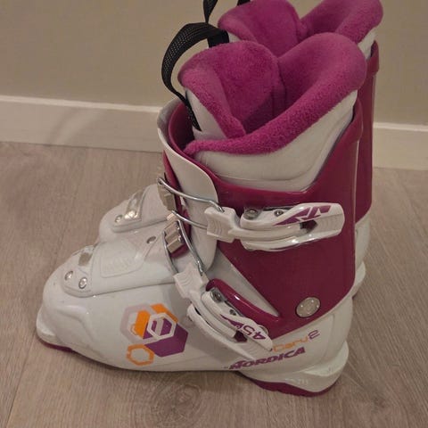 Nordica Alpin skistøvler str 38 i sølvfarge. Modellen har flere justerbare spenner foran for god tilpasning rundt fot og ankel. Innerstøvelen er polstret for økt komfort og støtte. Passer til bruk i alpinbakke med standard alpinski-bindinger.