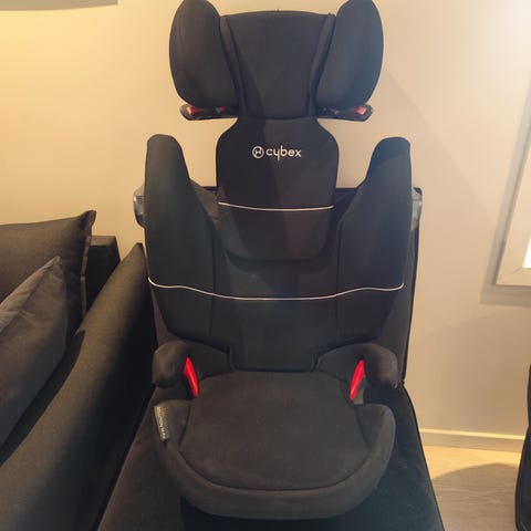 Setet er et bilbarnesete med høy rygg og sidebeskyttelse. Det har justerbar hodestøtte og armlener. Farge: svart med lyse detaljer.