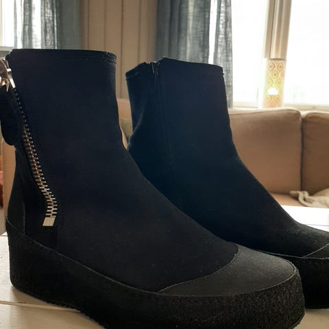 Nude of Scandinavia vinterstøvler i størrelse 39. Støvlene er i svart materiale med grov, brun yttersåle og lys mellomsåle. De har glidelås foran for enkel av- og påtaking. Innvendig er de fôret med mykt, lyst fôr som gir ekstra varme. Overdelen er middels høy og dekker ankelen godt. Egnet som varme vinterstøvler til hverdagsbruk i kaldt vær.