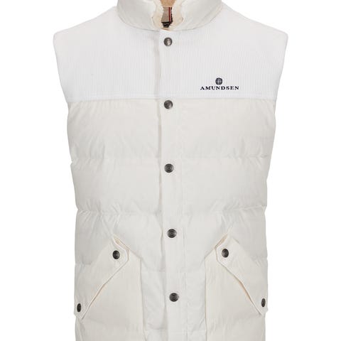Yttermateriale i økologisk bomull og kord-detaljer over skulderpartiet. Vesten er fylt med resirkulert dun (fillpower 750, 90dun/10fjær). Kragen er lun og god med hvit ull-fleece liner.