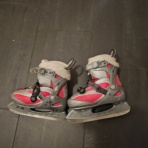 Frost barne skøyter i størrelse 32-35. Skøytene er i rosa og grått med myk, polstret innersko og syntetisk yttermateriale. De har justerbare spenner og stramming foran for å gi bedre passform rundt foten. Egnet til barn som trenger skøyter til generell skøytebruk på isbane eller uteis.