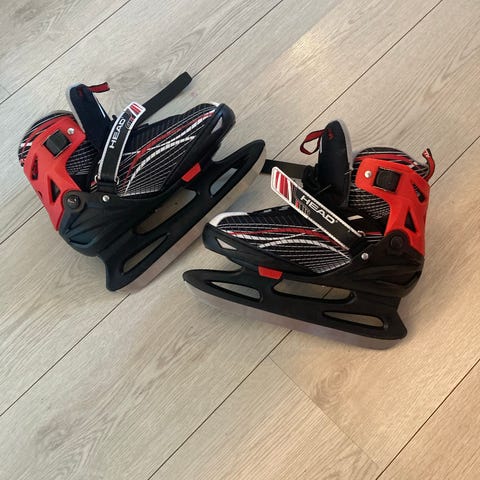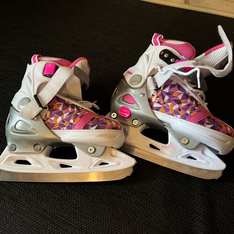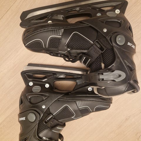 Zandstra justerbare skøyter for barn i størrelse 31-34. Skøytene har hard yttersko med justerbare spenner og borrelås, samt mykere innersko for bedre passform og støtte. Fargekombinasjon hovedsakelig svart, grå og rød. Egnet til generell skøytebruk på is for barn i aktuell skostørrelse.