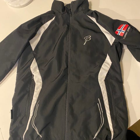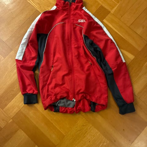 Swix langrennsjakke i herre størrelse S. Jakken er hovedsakelig blå med røde og hvite detaljer, hel glidelås foran og høy krage. Den har klubbtrykk med «Skiline» og «NTG» på front og rygg. Egnet som ytterjakke til langrenn og annen utendørs aktivitet i kjølig vær. Laget i lett, teknisk materiale med to sidelommer med glidelås.