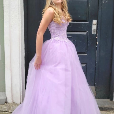 Nydelig mørkblå ballkjole kjøpt på Tina Ritzi Selskapskjoler i Drammen. Kjolen er i Str S og har snøring i ryggen. Kjolen er brukt 2 ganger og har ingen skader.