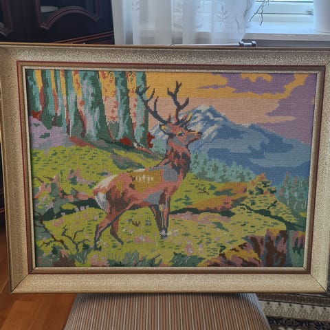 Vintage brodert bilde av hjort – Flott hytteinteriør / Retro dekor