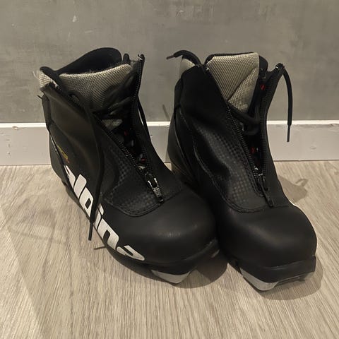 Alpina langrennsstøvler i størrelse 36. Støvlene er i svart og grått med snøring og glidelås under beskyttende klaff. Overdelen er i syntetisk materiale med tekstilfôr på innsiden. Passer til klassisk langrenn.