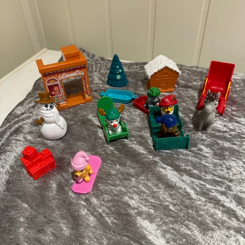 Paw Patrol lekefigurer og kjøretøy sett. Inneholder flere små figurer fra Paw Patrol-universet, ulike sleder og kjøretøy, samt tilbehør som hus, snømann og andre smådeler. Plastfigurer og tilbehør er i barnevennlig størrelse og egner seg til rollelek og temalek med Paw Patrol-karakterer. Passer for barn som liker Paw Patrol og små lekesett med figurer og kjøretøy.