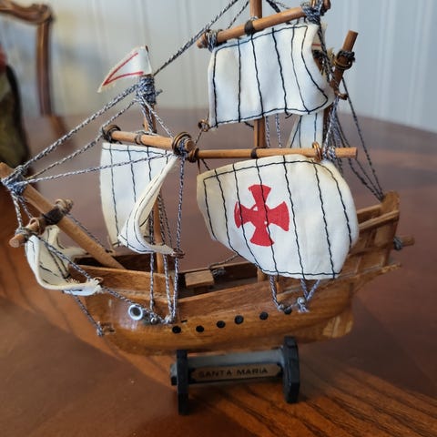 Selger mitt detaljerte modellskip av et historisk seilskip med flere master, seil og rigg. Skroget er i tre med markerte kanonporter og små detaljer langs skutesiden. Modellen er vanvittig detaljert og sjeldent godt bevart