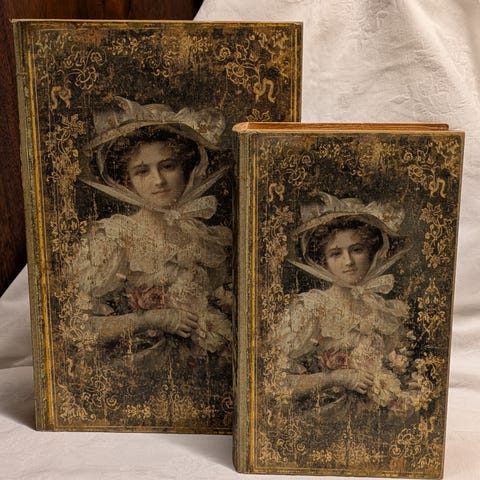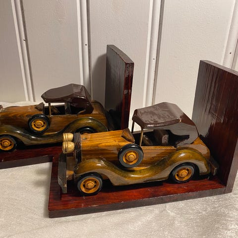 En stilig gammel bokstøtte. Den er 19 cm lengde, 16 cm høy og 11 cm dybde. Med skuffer på hver bok. 3 skuffer.