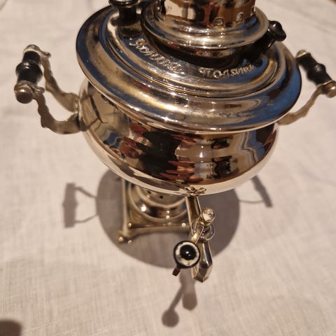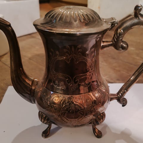 Fuller tekanne i metall med rund, flat form og tre små føtter med dekor. Kannen har helletut med liten kjede til propp, samt avtagbar korkpropp i lokket. Overflaten er blank metall med inngravert «Fuller» på siden. Egner seg som tekanne eller som dekorativ gjenstand i kjøkken eller stue.