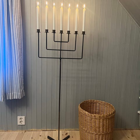 Den er i bra bruksstand, men malingen har flasset litt på foten og på en av lysholderne (som er forsøkt malt opp). Dette sees tydelig av bildene. Men dette er ikke noe en tenker på når den står og er i bruk.