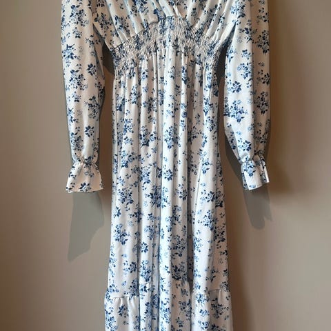 Kjøpt nytt og aldri brukt. Jeg er 162 cm og den rekker helt ned til foten på meg. Selger da den bare henger i skapet, i håp om at noen andre kan få gleden av å bruke denne fine kjolen.