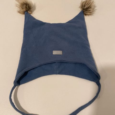 Babylue i blå bomull for baby, størrelse 40-44 (tilsvarer cirka 2-4 måneder). Innsiden har et mykt fôr i fleece. Ble brukt bare et par ganger før ungen vokste seg ut av den... så den fremstår som ny.