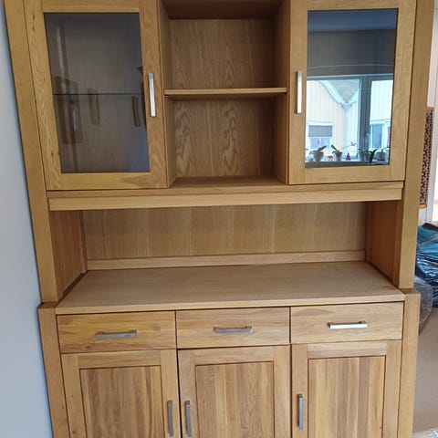 Solid møbel med fine detaljer og messingbeslag. God plass til både pynt, servise og oppbevaring.