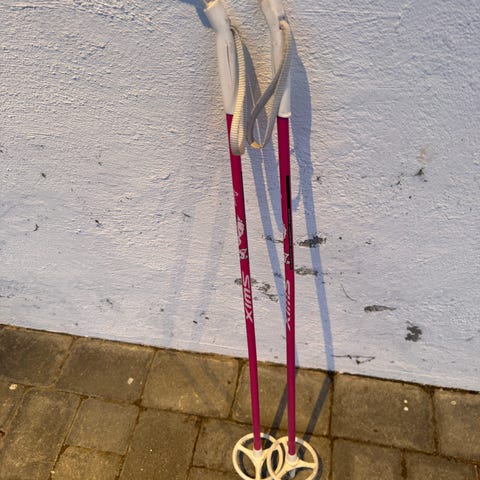 Swix Frost skistaver i lengde 100 cm. Stavene er rosa med blå detaljer og har metallspisser, blå trinser og lilla/blå håndtak med justerbare håndstropper.
