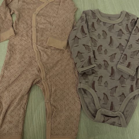 Settet består av én heldress med pingvinmønster og én langermet body med mønster og stjerner på brystet. Begge plaggene har trykknapper for enkel av- og påkledning og bleieskift. Passer til baby i størrelse 68, og kan brukes til hverdags eller som koseplagg inne.